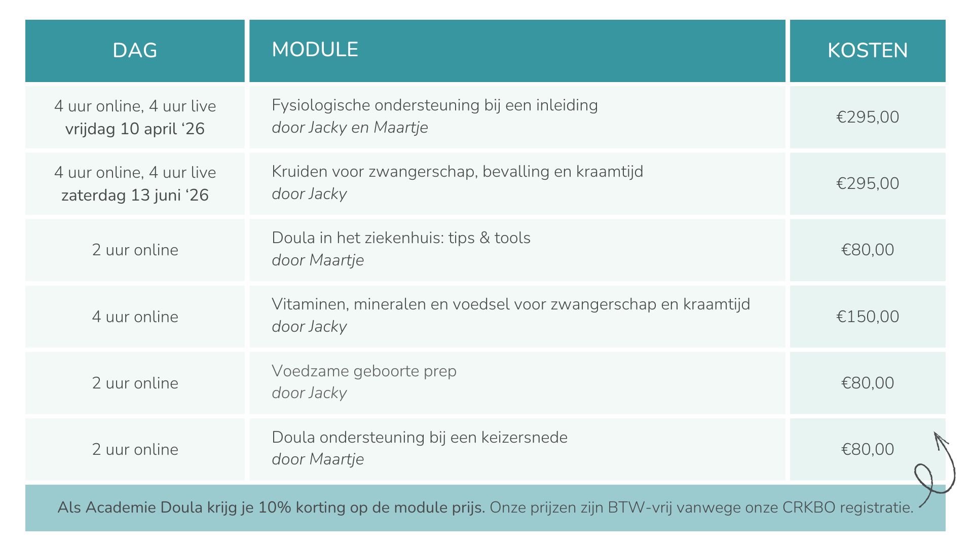 - Inleveren businessplan uiterlijk eind november 2026 (als je de complete Academie Doula opleiding volgt)